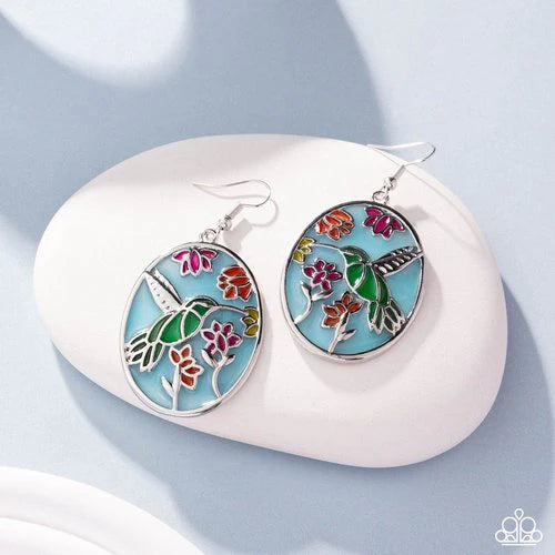Featuring Limpet Shell, Green Grass, Pink Peacock, Orangeade, and Marigold spots of paint, a hummingbird flutters against a silver oval backdrop full of colorful flowers for a whimsically radiant lure. Earring attaches to a standard fishhook fitting.