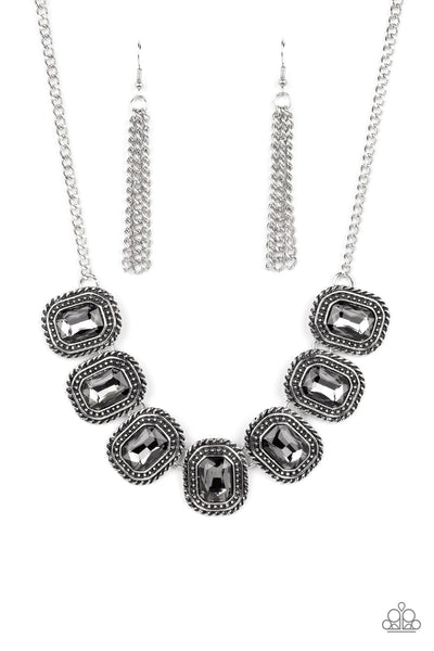 Pressed into silver, chain-like frames, radiant-cut hematite rhinestones smolder below the collar in a jaw-dropping finish. Each frame is embellished with twisted texture and subtle silver studs, bringing a gritty contrast to the design. Features an adjustable clasp closure.