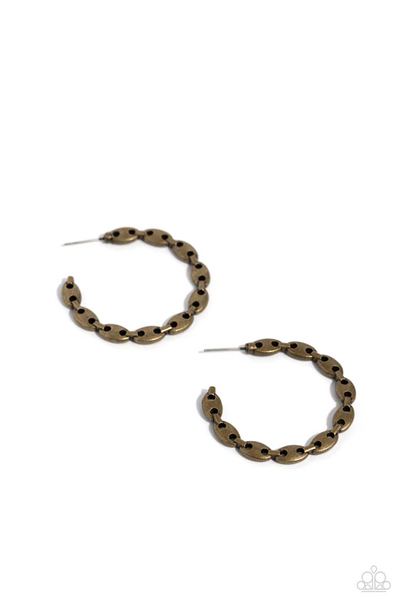 Featuring pairs of airy circles, flat and oval brass beads connect into an intricate hoop for an intense industrial vibe. Earring attaches to a standard post fitting. Hoop measures approximately 1 1/2" in diameter.