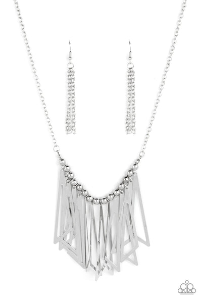 Flared silver triangular frames swing from a silver beaded chain below the collar, creating an intense industrial-inspired fringe at the bottom of a classic silver chain. Features an adjustable clasp closure.
