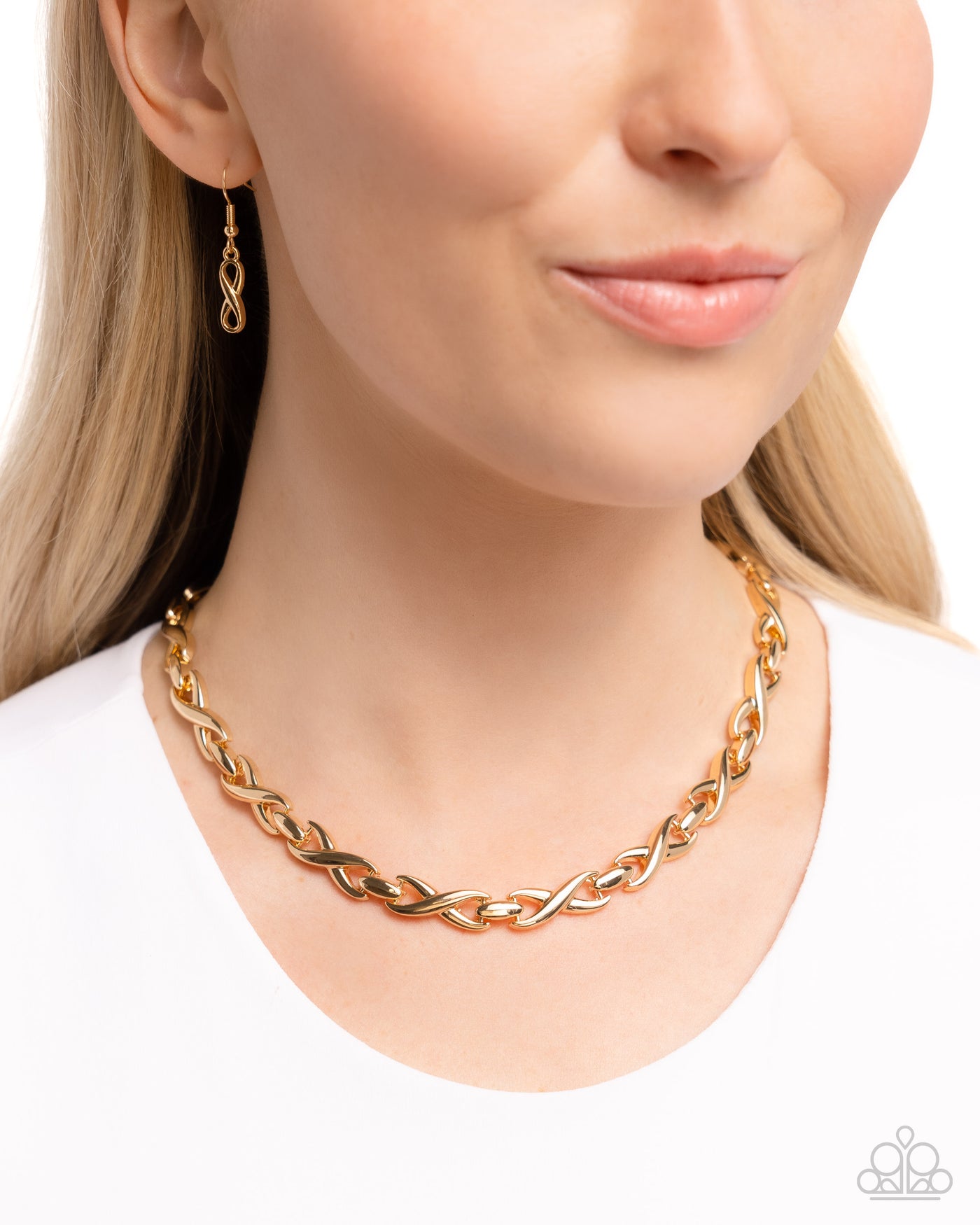 Featuring a high-sheen, gold links twist and curve into infinity-like frames that delicately connect around the collar for an iconic look. Features an adjustable clasp closure.