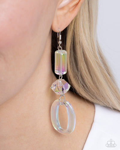 Featuring an iridescent hue, a cylindrical bead, a highly-faceted chunky bead, and an oversized oval elongate down the ear for a reflective, radiant display. Earring attaches to a standard fishhook fitting. Due to its prismatic palette, color may vary.