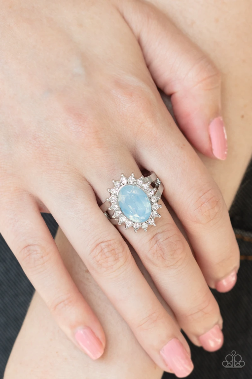 Featuring an opalescent shimmer, an oval iridescent pink gem is pressed into the center of a flowery silver frame radiating with white rhinestone petals. Features a dainty stretchy band for a flexible fit.