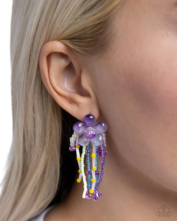 A frosted orange acrylic flower with a glassy orange center glistens from the ear. Strands of glassy and pearlized turquoise, yellow, apple green, pink, and orange seed beads and white pearls in round and cylindrical shapes flourish from the orange flower, mimicking whimsical vines. Earring attaches to a standard post fitting.