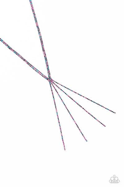 Featuring sleek square fittings, two strands of glittery, dainty multicolored blue rhinestones connect down the chest for a refined centerpiece. The interconnected rows delicately give way to freefalling multicolored blue layers, creating additional strands of glitzy movement. Features an adjustable clasp closure.