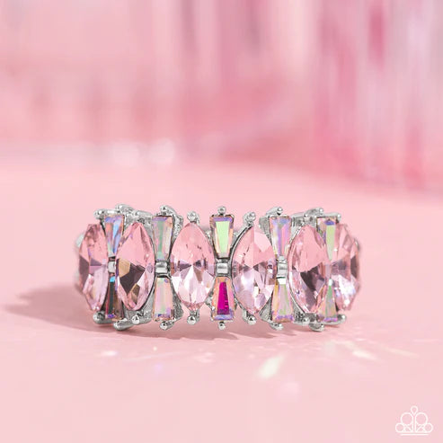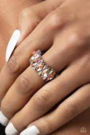 A row of glassy orange marquise-cut rhinestones, encased in dainty silver-pronged fittings, alternate with dainty silver-pronged iridescent rhinestone bars as they connect across the finger, creating a knockout kaleidoscope of color. Features a dainty stretchy band for a flexible fit. Due to its prismatic palette, color may vary.