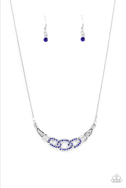 Shiny silver links, encrusted with dainty blue rhinestones, connect into a glamorous centerpiece below the collar. Features an adjustable clasp closure.