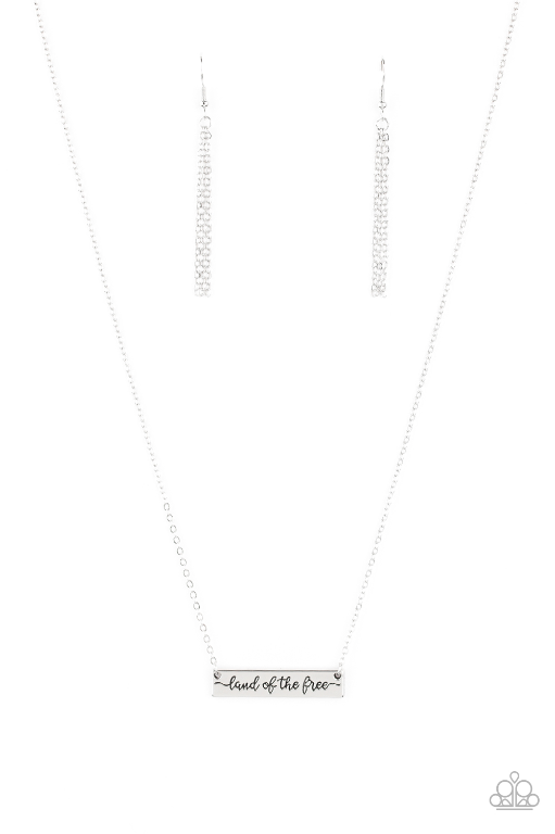 Stamped in the phrase, "Land of the free," a silver rectangular frame is suspended by a dainty silver chain below the collar for a patriotic inspired look. Features an adjustable clasp closure.