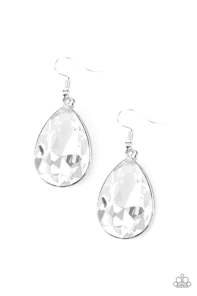 An oversized white teardrop rhinestone is nestled inside of a sleek silver frame for a dramatic look. Earring attaches to a standard fishhook fitting.