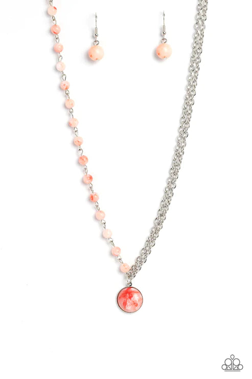 Dangling from a classic silver chain, an orange stone, spotted with multicolored specks rests below the collar. A silver chain, infused with stony beads in the same orange, spotted hue adds further earthiness to the design. Features an adjustable clasp closure. As the stone elements in this piece are natural, some color variation is normal.