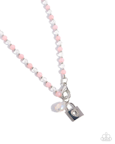 Infused along an invisible string, a collection of faceted light pink and clear beads alternates with dainty silver studs around the neckline for a faceted flair. Dusted in white rhinestones, a silver heart silhouette padlock, and a UV shimmery clear teardrop bead swing from the beaded strand for a romantic finish. Features a clasp closure.