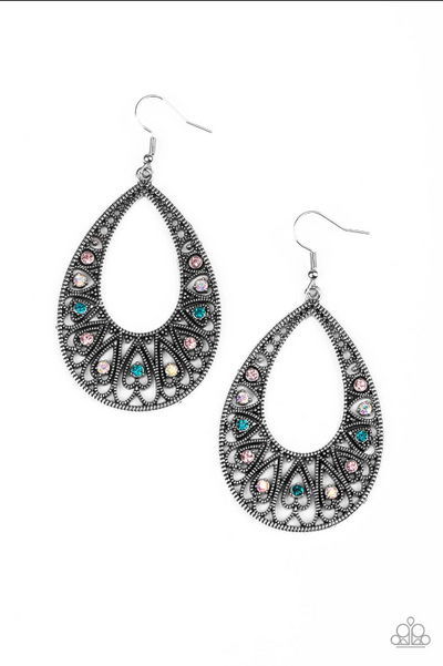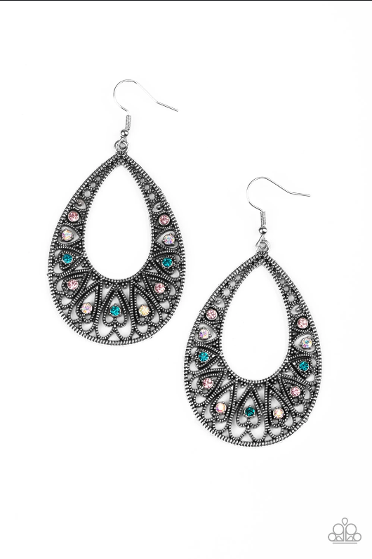 Dotted with dainty yellow rhinestone centers, studded silver heart frames fan out into a shiny silver teardrop frame for a lovable look. Earring attaches to a standard fishhook fitting.