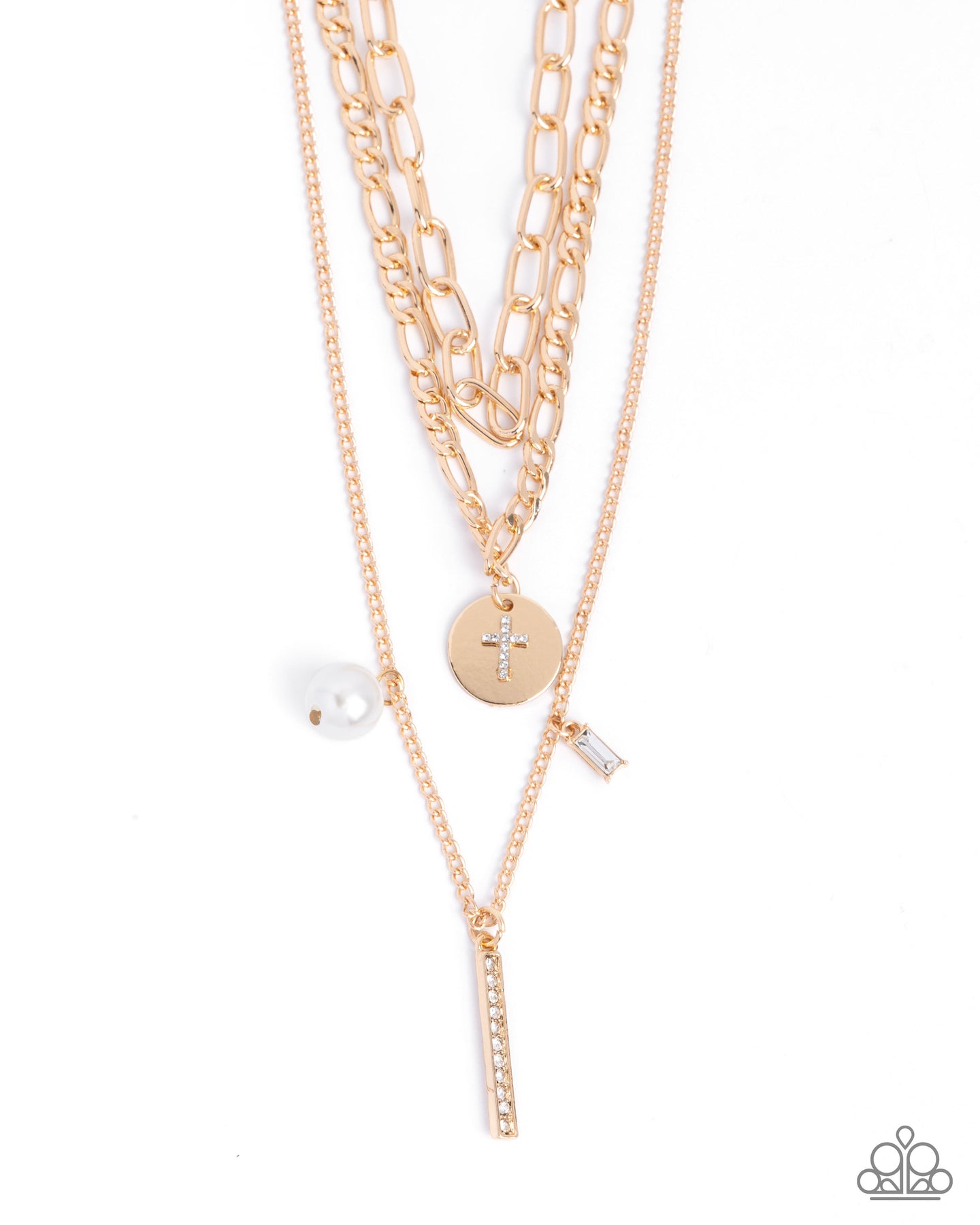 Featuring a high sheen, a trio of mismatched gold paperclip, figaro, and classic chains layer below the neckline. Gliding along the middlemost chain, a dainty white rhinestone cross stands out atop a subtly hammered gold disc while an oversized white pearl, solitaire emerald-cut white gem, and white rhinestone-dusted cylindrical gold skinny bar sway from the lowermost chain for a devoutly dazzling display. Features an adjustable clasp closure.
