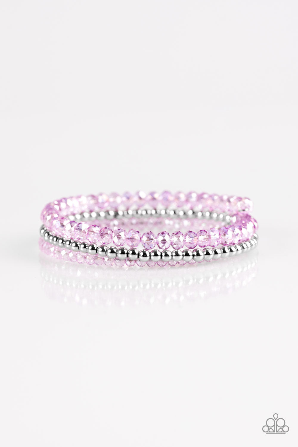 Sections of sparkling purple crystal-like beads and dainty silver beads are threaded along a coiled wire, creating a glittery infinity wrap style bracelet.