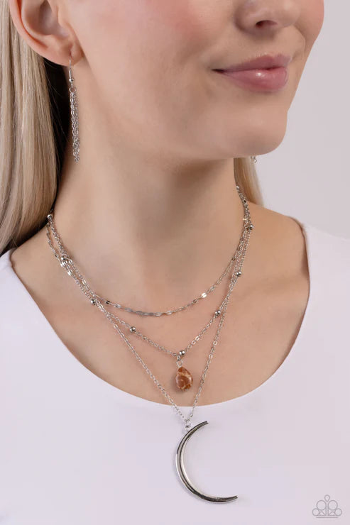 Three dainty silver chains delicately layer below the collar. Antiqued silver links form the uppermost chain, while a blue teardrop bead rests amidst silver studs on the centermost chain. A silver crescent moon pendant swings from the bottom of the display for a mystical finish. Features an adjustable clasp closure. As the stone elements in this piece are natural, some color variation is normal.