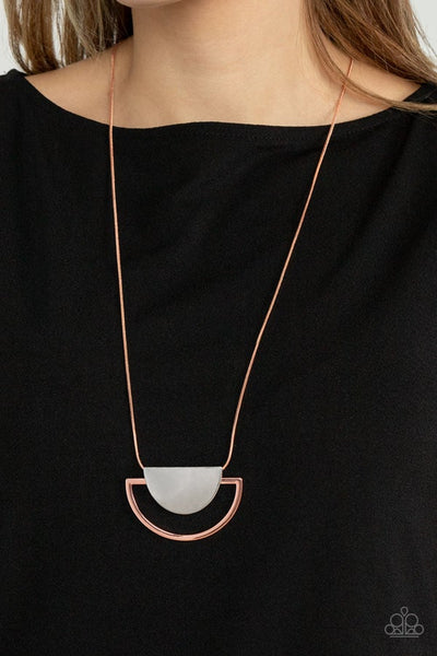 A solid silver halfmoon frame delicately overlaps a shiny copper halfmoon silhouette, creating a classic mixed metal palette at the bottom of a shiny copper snake chain. Features an adjustable clasp closure.