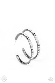 Hoop Earring: "Global Gleam" (P5HO-BKXX-163TJ)- The front-facing edge of a delicately hammered gunmetal hoop is encrusted in glassy white rhinestones for a blinding look. Earring attaches to a standard post fitting. Hoop measures approximately 2" in diameter.