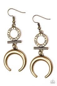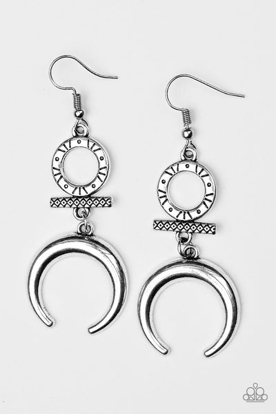 A shimmery silver crescent swings from the bottom of delicately stacked silver frames radiating with geometric patterns for a tribal inspired look. Earring attaches to a standard fishhook fitting.