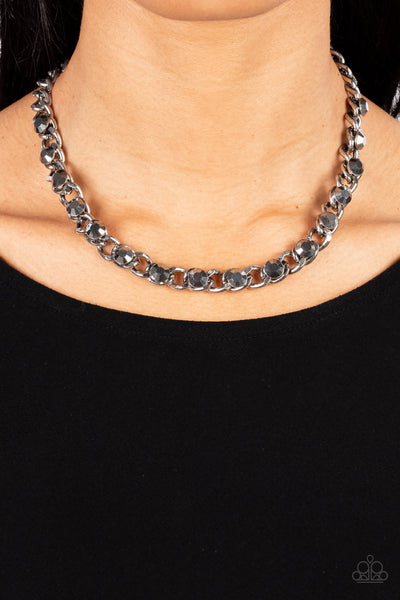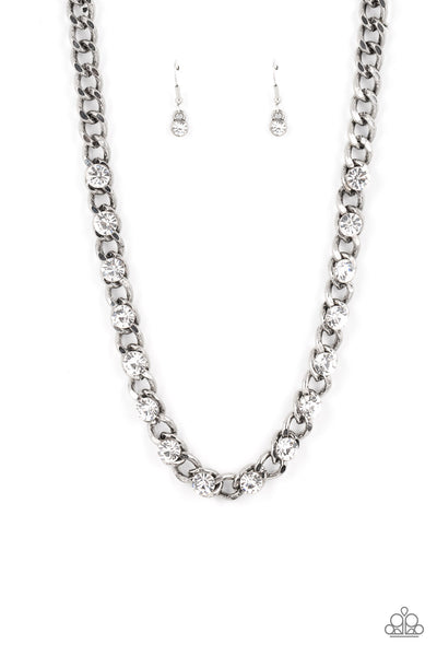 Oversized white rhinestones dot a row of oversized silver chain, resulting in a gritty glitz below the collar. Features an adjustable clasp closure.
