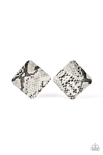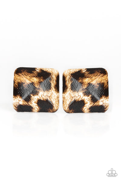 Featuring a cheetah-like print, an overly dramatic square frame dots the ear for a statement-making look. Earring attaches to a standard post fitting.