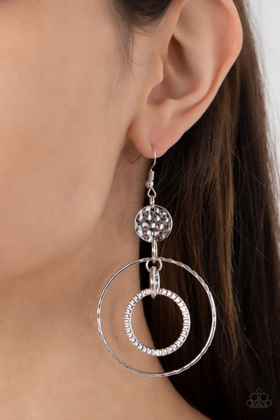 A mismatched pair of hammered and textured silver hoops link at the bottom of a hammered silver disc, creating an edgy lure. Earring attaches to a standard fishhook fitting.