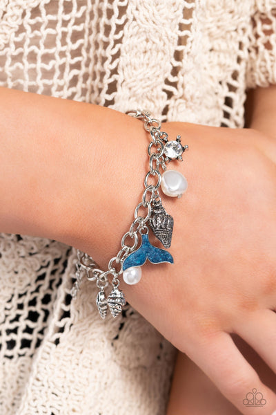 A fringe of silver seashells in varying sizes and textures, white baroque pearls, a studded sea flower charm with a white gem center, and a sparkly, blue-swirled mermaid tail swings from a silver link chain, creating whimsical, oceanic movement around the wrist. Features an adjustable clasp closure.
