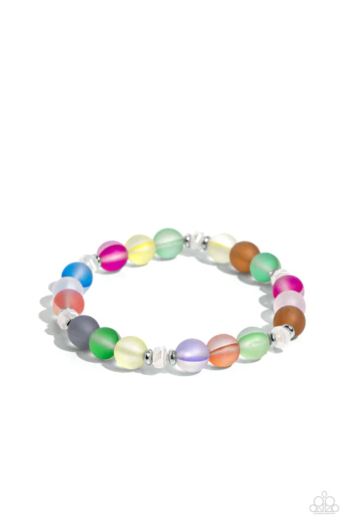 Infused with silver accents and faceted white beads, a dreamy collection of frosted glassy white beads is threaded along a stretchy band around the wrist for an enchanting glow.