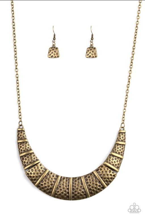 Brushed in an antiqued finish, hammered brass plates link below the collar, creating a bold crescent pendant for a statement-making look. Features an adjustable clasp closure.