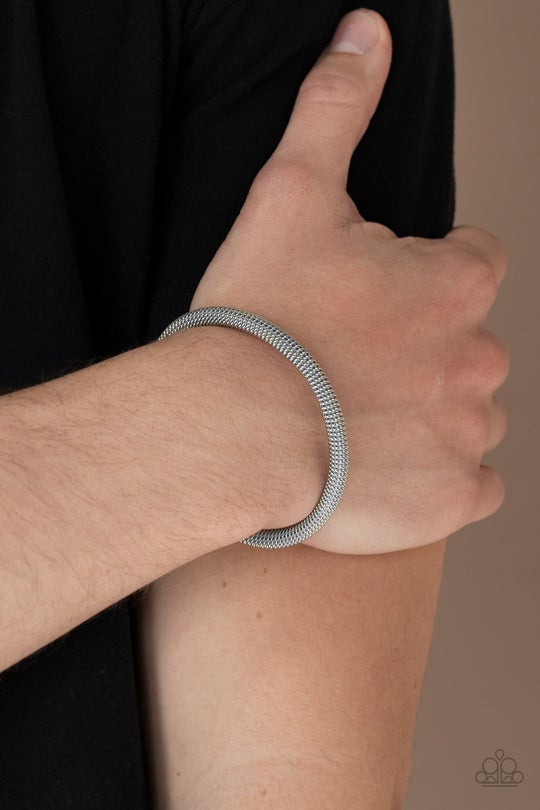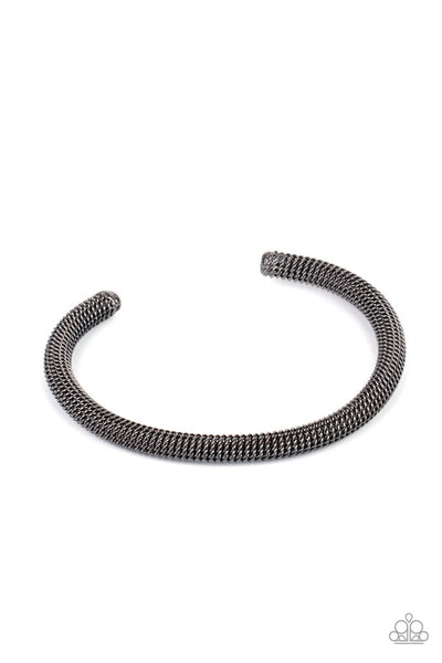 A dainty row of glistening gunmetal chain twists around a gunmetal cuff, creating an edgy industrial display around the wrist.