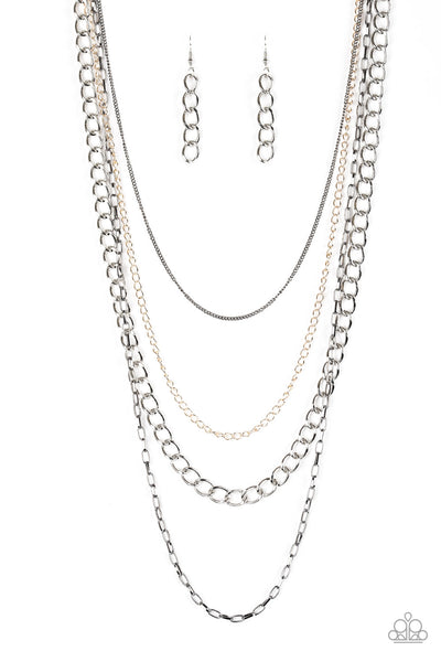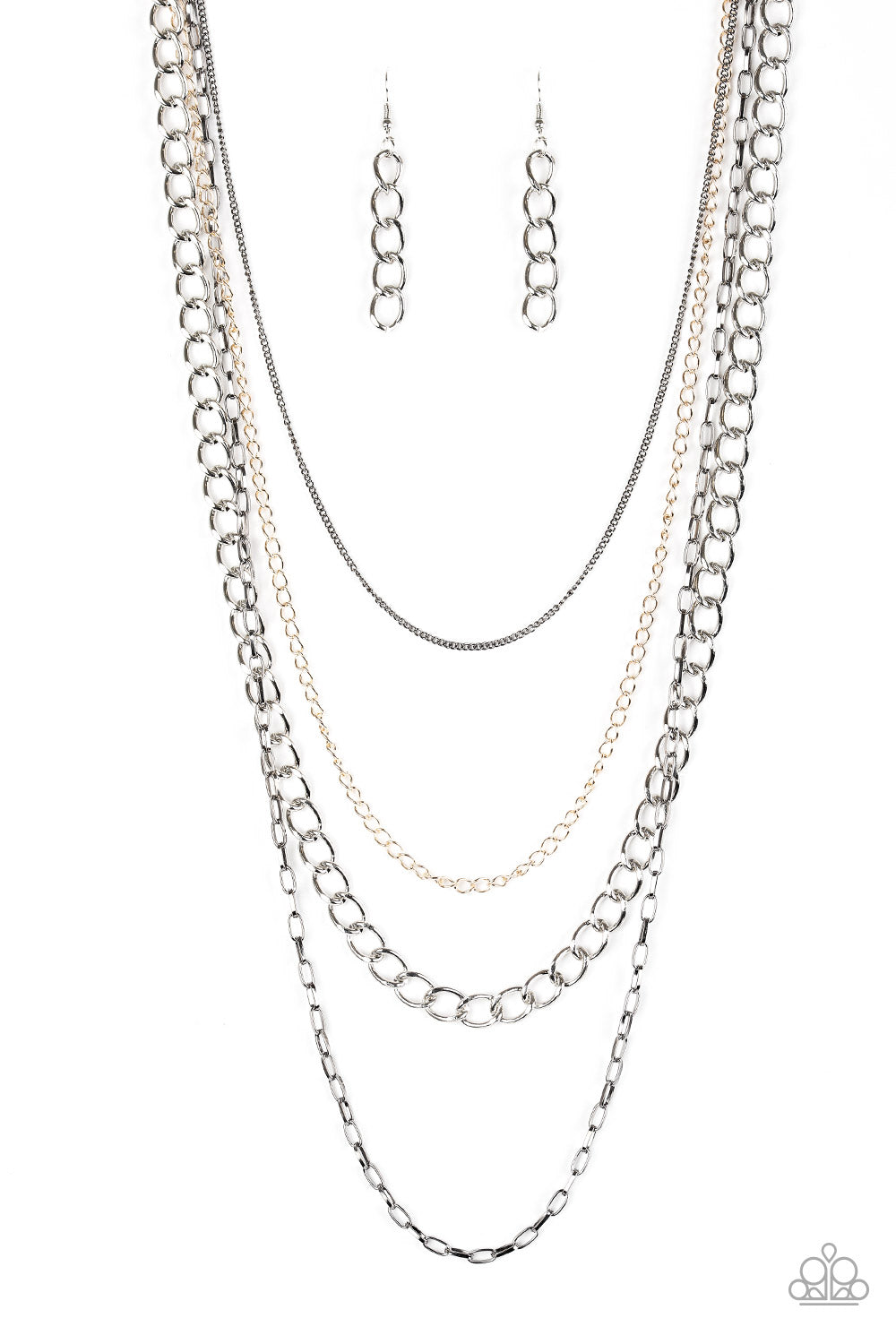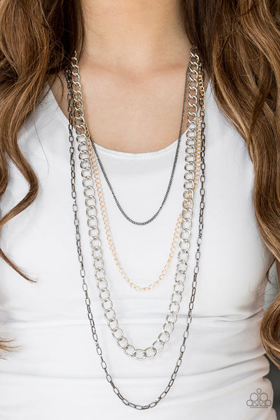 A mishmash of gold, gunmetal, and silver chains drape across the chest for a collision of edgy textures. Features an adjustable clasp closure.