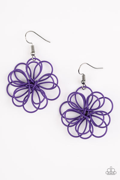 Brushed in a vivacious purple finish, intricate wires are shaped as petals and knotted in the center to create a small delicate silhouette of a daisy. Earring attaches to a standard fishhook fitting.