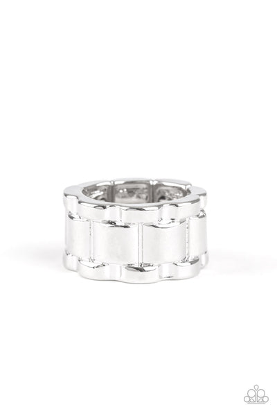 Embossed in a tread-like pattern, an ornate silver band arcs across the finger for a bold look. Features a stretchy band for a flexible fit.