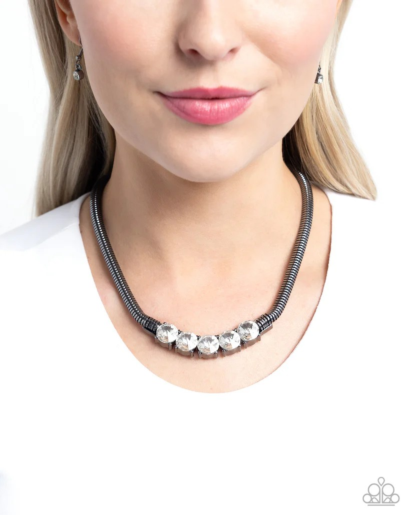 Pronged in place along the center of a thick gunmetal chain, faceted white gems twinkle below the neckline for a glittery, grungy look. Features an adjustable clasp closure.