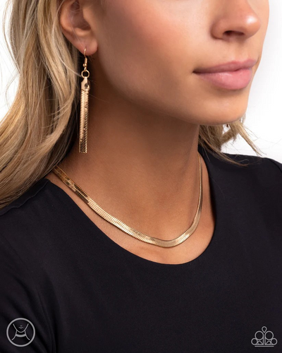 Featuring a sleek gold finish, a herringbone chain loops below the collar for a bold basic. Features an adjustable clasp closure.