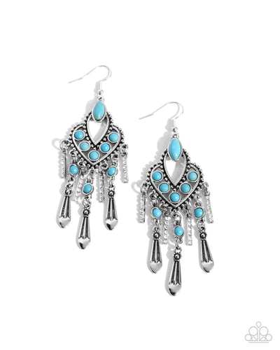 Gradually tapering below the ear, glassy white rhinestones embellish along silver bars while turquoise-beaded flared bars create a dramatic fringe at the bottom of a decorative silver-studded frame swirling with turquoise stones in round and marquise-cuts for an over-the-top earthy lure. Earring attaches to a standard fishhook fitting. As the stone elements in this piece are natural, some color variation is normal.