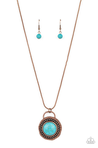 A dainty copper snake chain gives way to a marbled turquoise stone pressed into the center of a copper-studded frame. Etched lines of texture fan out from the center, in an artisanal finish. As the stone elements in this piece are natural, some color variation is normal. Features an adjustable clasp closure.