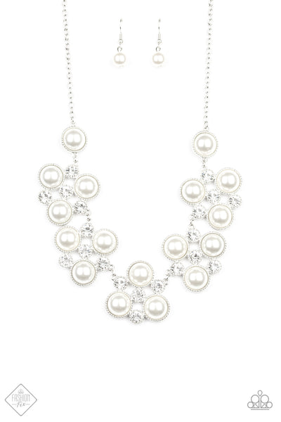 Sleek silver frames adorned in a refined mix of oversized white pearls and glassy white rhinestones, delicately link below the collar for a dramatically glamorous look. Features an adjustable clasp closure.