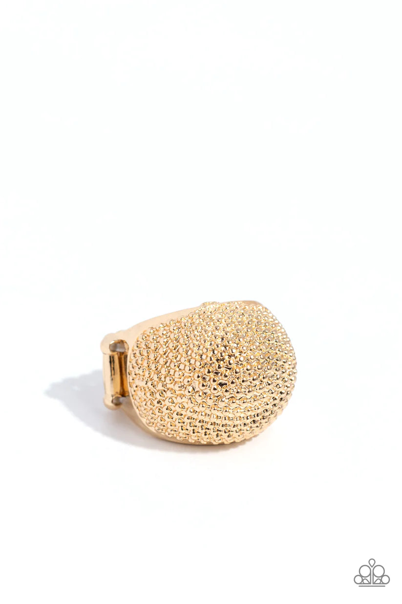 Dotting the surface of an extended gold frame, dainty gold studs seemingly pop off the finger, reflecting light off its every surface for an industrial finish. Features a stretchy band for a flexible fit.