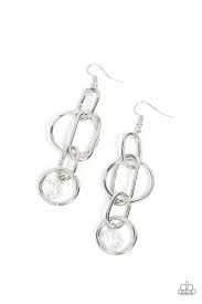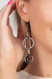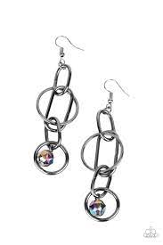 A collection of oval and round gunmetal links, embellished with a faceted oil spill bead suspended inside the bottom most round frame, coalesce into a flirty charm as it sways from the ear. Earring attaches to a standard fishhook fitting.