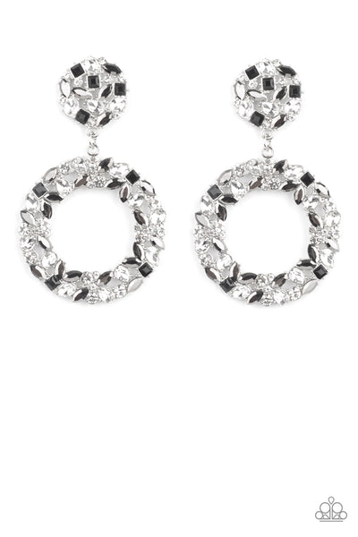 A sparkly wreath of marquise cut hematite, black square, white teardrop, and classic white rhinestones delicately swing from the bottom of a matching round frame, creating a dramatically dazzling statement piece. Earring attaches to a standard post fitting.