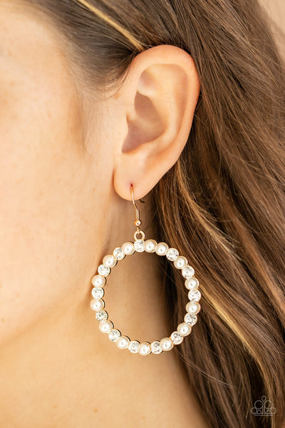 Bubbly white pearls and glassy white rhinestones alternate along the front of a shimmery gold hoop for a timeless look. Earring attaches to a standard fishhook fitting.