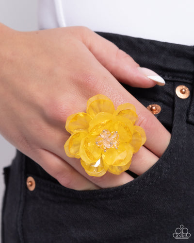 Acrylic petals in a clear and matte finish bloom around a clustered collection of peachy glass beads for an elegantly dainty display. Features a stretchy band for a flexible fit.
