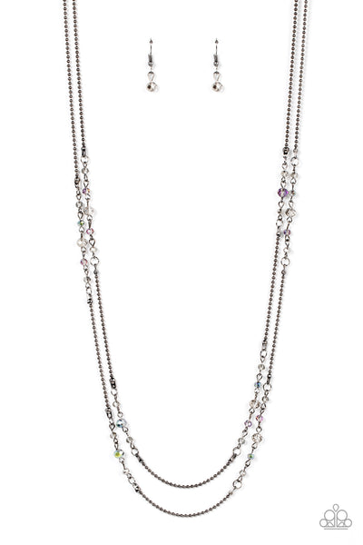 Sections of iridescent and smoky crystal-like beads embellish strands of dainty gunmetal beaded chains, resulting in prismatic layers across the chest. Features an adjustable clasp closure.