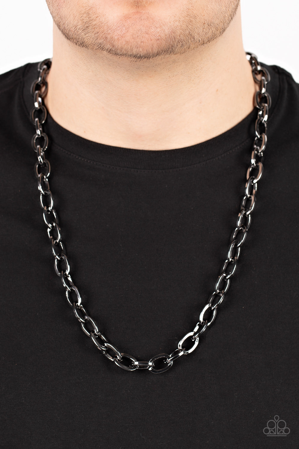 A dramatically oversized collection of oval gunmetal links boldly interlock across the chest, resulting in an intense industrial centerpiece. Features an adjustable clasp closure.