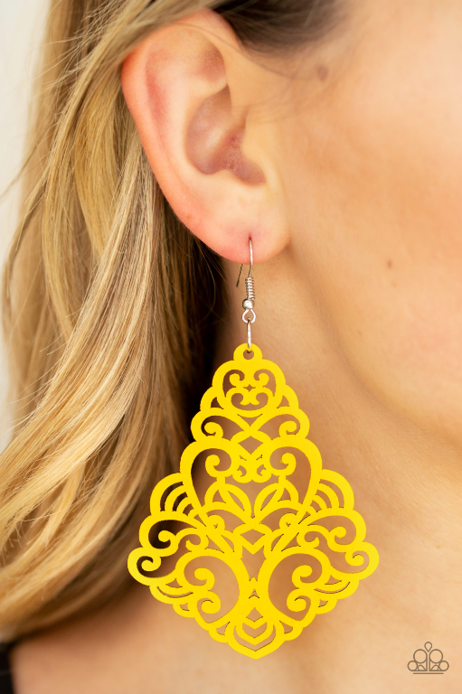 Painted in a refreshing blue finish, an airy wooden frame swirling with filigree detail swings from the ear for a seasonal look. Earring attaches to a standard fishhook fitting.