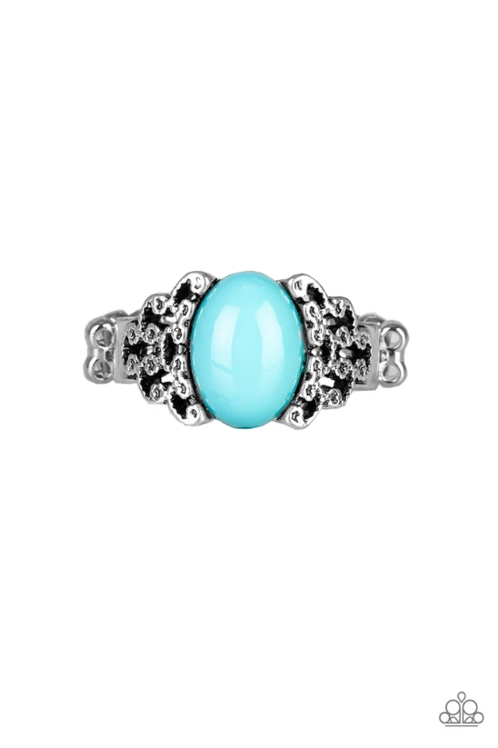 A refreshing blue bead is pressed into the center of a shimmery silver band swirling with frilly filigree for a whimsical look. Features a dainty stretchy band for a flexible fit.