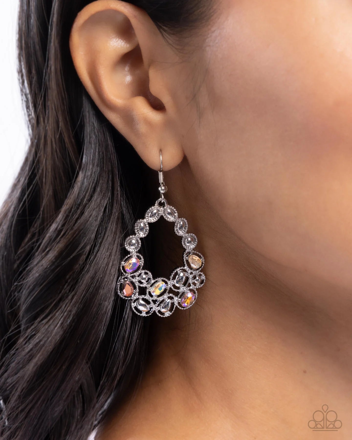 A collection of oval and teardrop-shaped rhinestones in iridescent, light topaz, aurum, and peach hues are encased in textured silver frames, creating a dazzling and elegant display. The rhinestones are linked together to form a teardrop-shaped design. Earring attaches to a standard fishhook fitting.