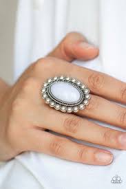 Painted in the timeless shade of Paloma, an oversized gray bead is pressed into the center of a textured silver frame radiating in a ring of shimmery silver studs for a whimsical pop of color. Features a stretchy band for a flexible fit.