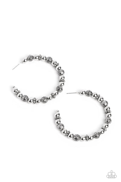 A collection of antiqued and decorative silver beads, silver wheel beads, and high-sheen silver beads are threaded along a thin curve around the ear for a trendy monochromatic look. Earring attaches to a standard post fitting. Hoop measures approximately 2" in diameter.