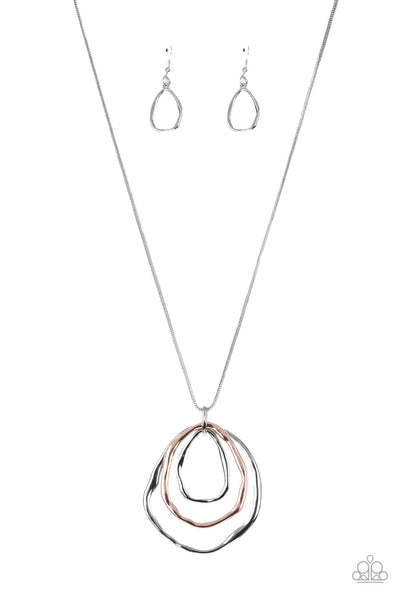 A trio of mismatched warped rose gold and silver rings swing from the bottom of a glistening silver chain, creating an asymmetrically stacked pendant. Features an adjustable clasp closure.